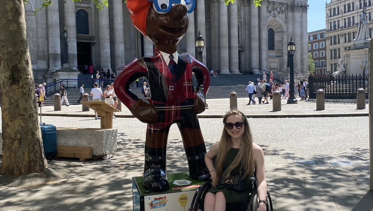 Caitlyn has helped shape a number of impactful projects, both individually and as part of the wider group. One standout moment was her involvement in ‘Morph’s Epic Art Adventure’, the UK’s first step-free accessible art trail across London. Her fashion-themed Morph statue, created in collaboration with Scottish designer Alison Black, featured an adaptive tartan suit and was proudly displayed outside St Paul’s Cathedral.